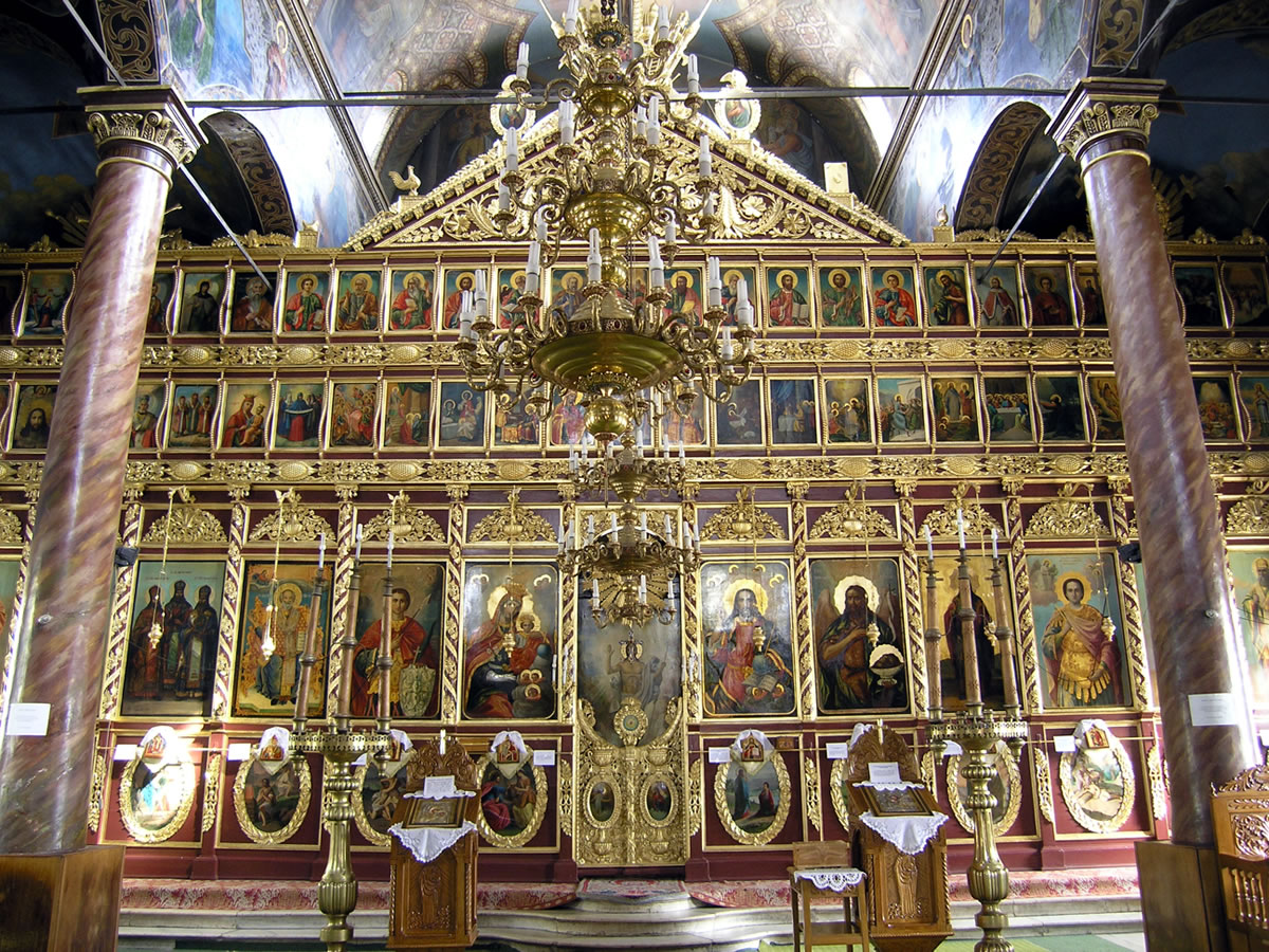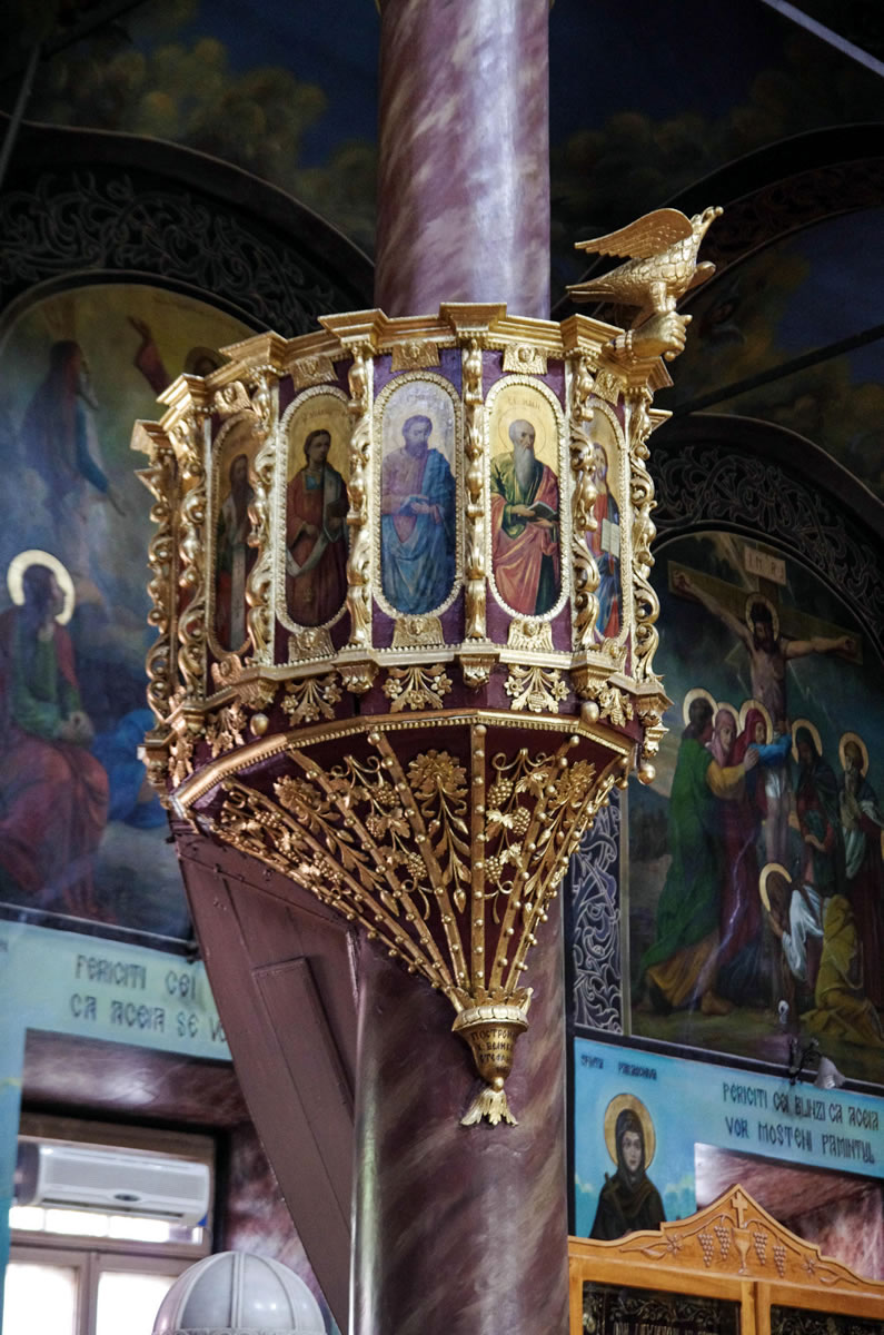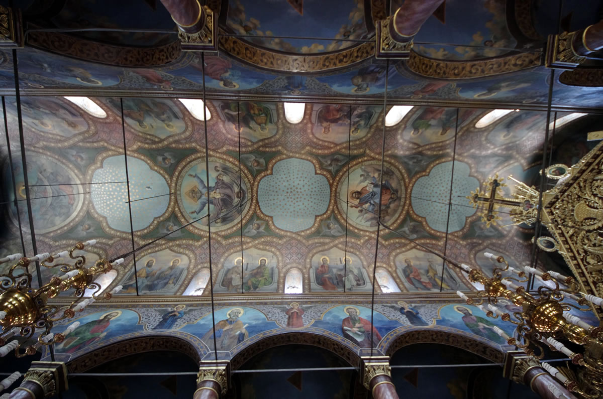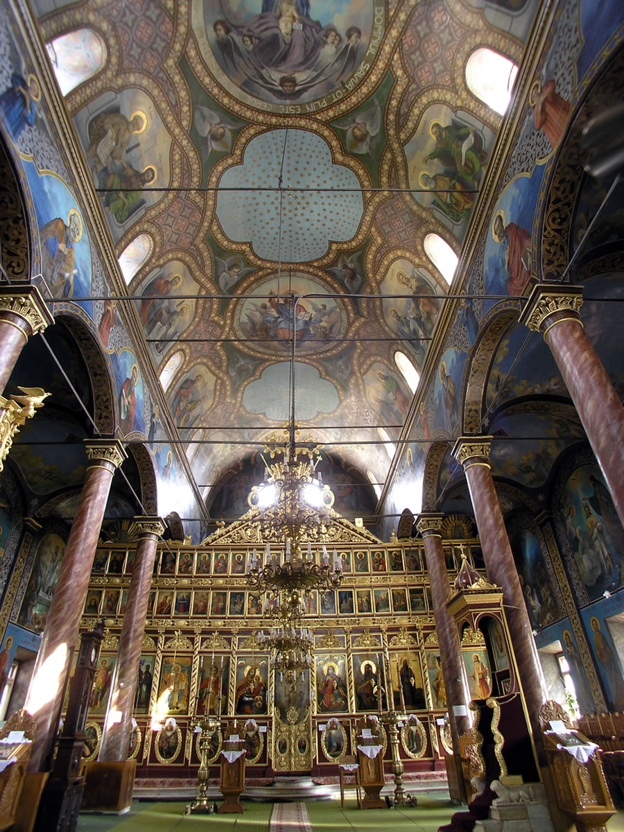 De uma luminosidade especial, a pintura se enquadra no estilo acadêmico, tendo sido executada entre 1923 e 1927 pelo pintor tulceano autodidata Mihail Paraschiv, chamado «O Pintor», mestre de Alexandru Ciucurencu. iconostase:Característica e motivo de orgulho para a igreja é sua excepcional iconostase, de dimensões incomuns (15x17m.), único na Romênia. Foi construída entre 1872 e 1874 pelo mestre búlgaro Anton Stanishev. Iconostases do mesmo período, na Bulgária, estãos nas igrejas da Santíssima Trindade de Shvishtov e são Nicolau de Vratsa. Combina luxuosamente motivos florais e zoomorfos com um número de, nada menos que 90 ícones, a maioria do século XIX. Muitas das peças da iconostase foram pintadas pelo grande pintor búlgaro Stanislav Dospevski e Enache Cardas, pintor romeno que estudou na Academia de Belas Artes em Florença, (Itália), e era mais conhecido em sua época em Dobruja. O ícone mais antigo do iconostase é de estilo grego, e foi pintado pelo monge Sofrônio de Palomeen (Monte Atos), em 5 de abril de 1862.